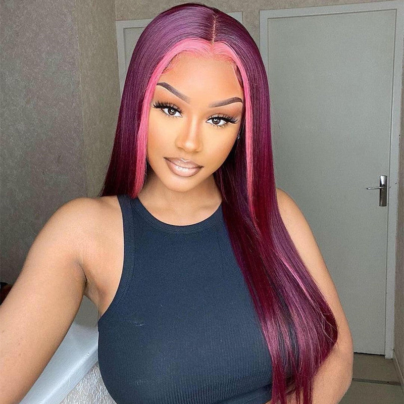 Skunk Strip Burg Color Middle Parted Straight Lace Frontal Closure Wigs