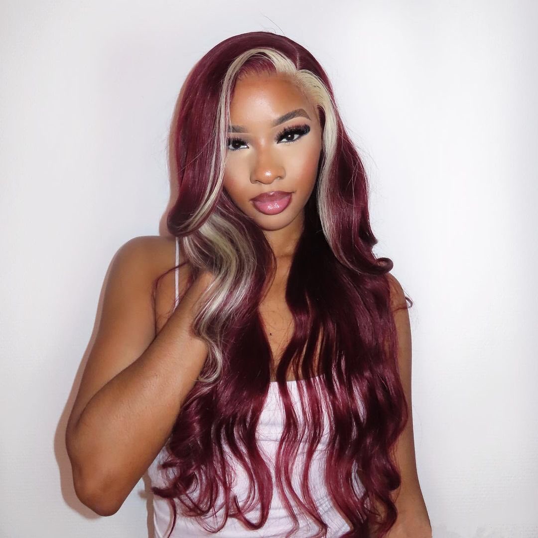 Skunk Strip Burg With Blonde Highlights Body Wave Human Hair Lace Closure Wig